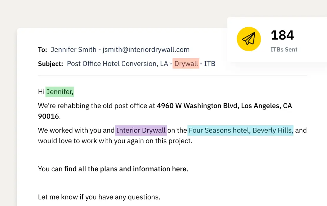 While other platforms make you manually sort drawings and send generic portal emails, Downtobid uses AI to build your packages and sends personalized invites that subs actually recognize.