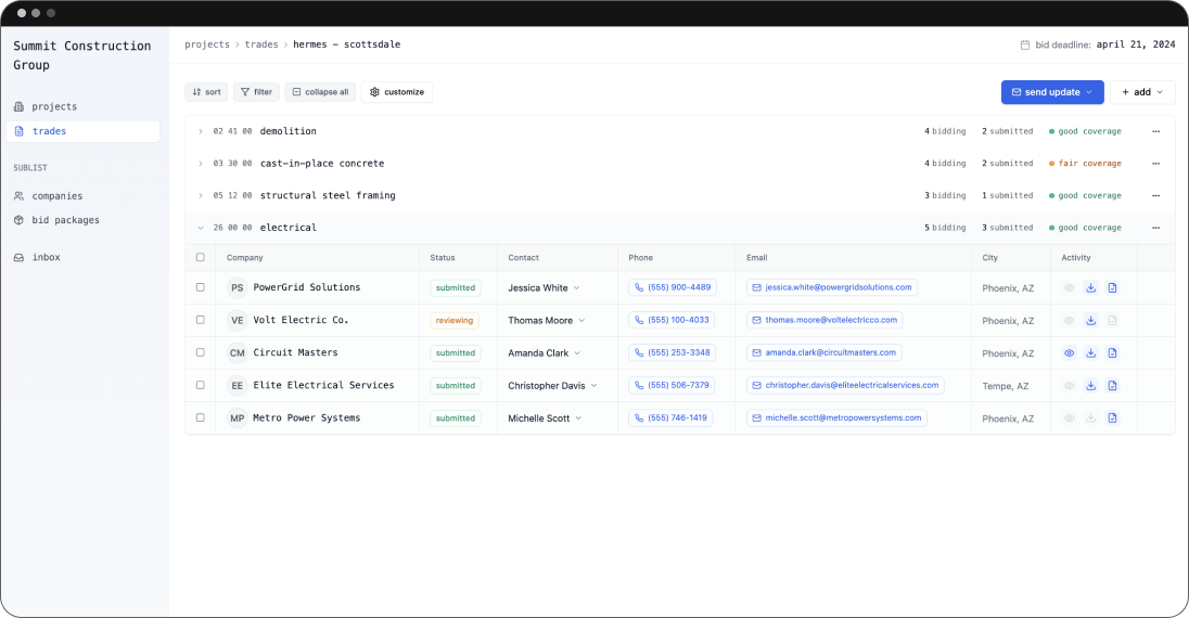 BuildingConnected’s high-volume approach means GCs can reach a lot of subcontractors, but bid coverage is inconsistent due to outdated contacts, mass invites, and a lack of follow-ups. This often leads to situations where GCs think they have enough coverage, only to find that many subs drop out or don’t respond at all.